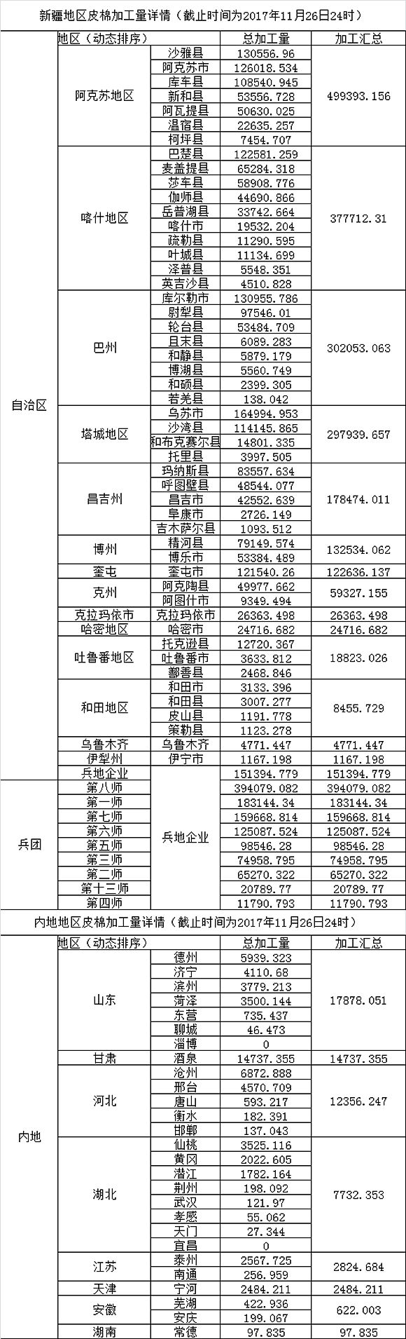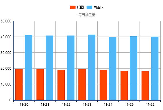 截止到11月26日新疆累計(jì)加工總量333.91萬(wàn)噸,其中兵團(tuán)加工量113.33萬(wàn)噸,地方加工量220.58萬(wàn)噸,日增量5.83萬(wàn)噸,日同比上升35.83%。新疆皮棉加工進(jìn)度72.4%,同比上升0.9%。