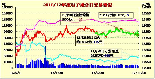 28日電子撮合交易成交量減少,整體合同均價(jià)多數(shù)收漲,多數(shù)合同上漲幅度較小,其中MA803成交量較大,為1510噸;活躍交投的合同多集中于遠(yuǎn)期合同,整體訂貨量總量有所減少,其中MA1803訂貨量最大,累計(jì)訂貨量為8060噸。國內(nèi)市場(chǎng)方面: 截止到2017年11月27日24點(diǎn),新疆地區(qū)皮棉加工總量339.36萬噸,其中,兵團(tuán)加工量115.09萬噸,地方加工量224.27萬噸,日增量5.61萬噸。近期,受市場(chǎng)資源供應(yīng)充足的影響,河北棉花市場(chǎng)呈弱勢(shì)整理態(tài)勢(shì),棉花企業(yè)籽棉收購積極性下降,企業(yè)為了規(guī)避風(fēng)險(xiǎn)從而下調(diào)籽棉收購價(jià)格;紡織企業(yè)庫存水平不一,但市場(chǎng)采購選擇性較大,因此現(xiàn)貨市場(chǎng)行情承壓,價(jià)格呈進(jìn)一步下調(diào)趨勢(shì)。
