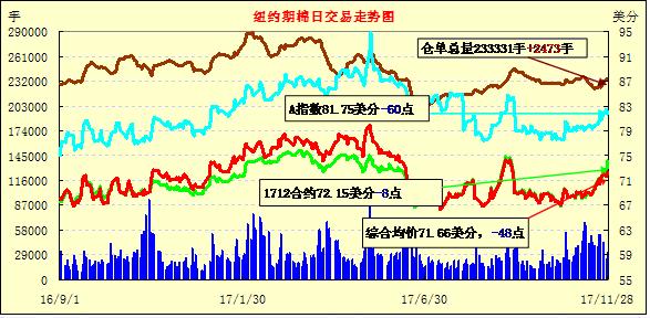 周二紐約期棉收漲,1712合約收于74.05美分/磅,漲190點(diǎn);1803合約收于72.14美分/磅,漲72點(diǎn)。周二主力合約先跌后漲,最高價(jià)72.29美分/磅,最終創(chuàng)今年9月8日以來最高收盤價(jià),漲幅1%;至本周,美棉采摘進(jìn)度僅較上周增加5個(gè)百分點(diǎn),全美采摘進(jìn)度低于預(yù)期。此外,德克薩斯拉伯克檢驗(yàn)所檢驗(yàn)的新花馬值繼續(xù)下降。
