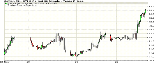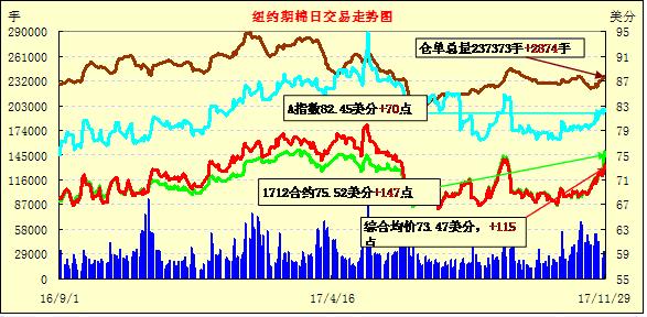預(yù)期上周美棉出口良好,周三紐約期棉繼續(xù)上漲;1712合約收于75.52美分/磅,漲147點;1803合約收于73.43美分/磅,漲129點。當(dāng)日主力合約開盤后小幅下挫并在短時間內(nèi)維持低迷走勢,合約沖高后最高價達(dá)到73.46美分/磅,并且最終收于當(dāng)日交投區(qū)間高位,漲幅1.8%,創(chuàng)9月5日以來最高收盤價。市場看好即將發(fā)布的美棉銷售數(shù)據(jù),另外良好的美國經(jīng)濟(jì)數(shù)據(jù)帶動美股上漲,分析師預(yù)測外部資金進(jìn)入棉花市場,使期價上漲。