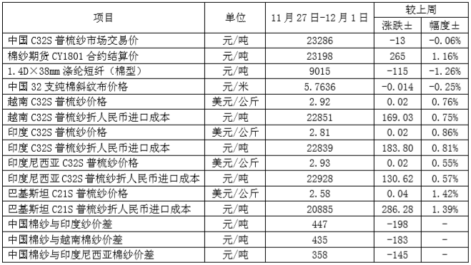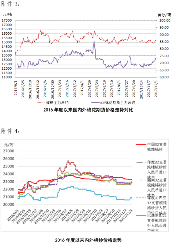 本周國內(nèi)新花收購接近尾聲,籽棉質(zhì)量下滑,企業(yè)開始壓低籽棉收購價,拖累皮棉現(xiàn)貨價格持續(xù)小幅下跌,鄭棉期貨價格隨ICE期棉走勢上漲。11月27日-12月1日代表內(nèi)地標(biāo)準(zhǔn)級皮棉銷售均價的國家棉花價格B指數(shù)15767元/噸,較上周下跌30元/噸,跌幅0.19%。鄭州棉花期貨CF1801合約結(jié)算價15194元/噸,較上周上漲254元/噸,漲幅1.72%。代表全國主產(chǎn)棉省(區(qū))白棉3級籽棉折皮棉均價的中國棉花收購價S指數(shù)14845元/噸,較上周下跌131元/噸,跌幅0.88%。