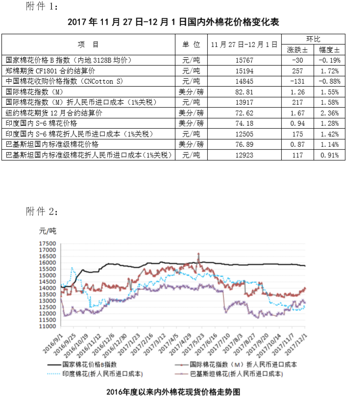 附件1:2017年11月27日-12月1日國內(nèi)外棉花價格變化表