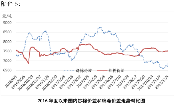 附件5:2016年度以來國內(nèi)紗棉價差和滌棉價差走勢對比圖
