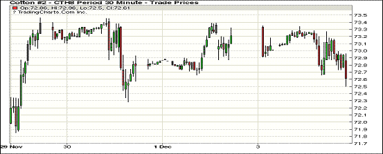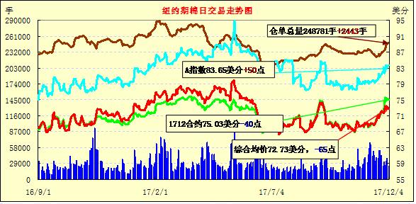 紐約期棉在本周第一個交易日收跌,1712合約收于75.03美分/磅,跌40點;1803合約收于72.58美分/磅,跌70點。當日多單獲利平倉,主力合約全天在壓力下交投。盤中在大量賣盤壓力下走低,收盤前依然處于當日震蕩區(qū)間底部。目前全美新花采摘已進入尾聲,至上周末美棉新花分級檢驗達到預(yù)測產(chǎn)量的51%,但德克薩斯新花質(zhì)量問題給質(zhì)量正常的新花帶來價格支撐。