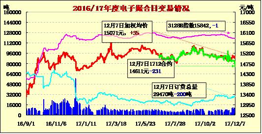 7日電子撮合交易成交量減少,整體合同均價多數(shù)收跌,合同下跌幅度較小,其中MA805成交量較大,為3660噸;活躍交投的合同多集中于遠期合同,整體訂貨量總量有所減少,其中MA1803訂貨量最大,累計訂貨量8740噸。截止到2017年12月6日24點,新疆地區(qū)皮棉加工總量386.34萬噸,其中兵團加工量129.61萬噸,地方加工量256.73萬噸,日增量4.93萬噸。雖11月新疆棉出疆44.81萬噸,但年關(guān)將近,紡企補庫積極性并不高,在部分企業(yè)國儲棉依然充足情況下,紡企小批量采購為主。