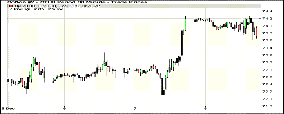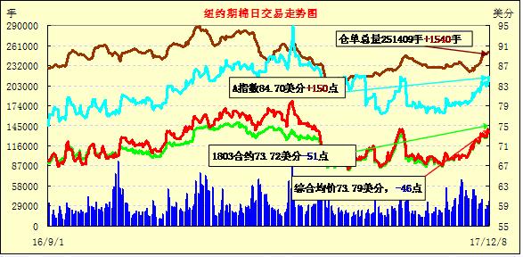 8日紐約期棉市場小幅下跌,主力3月合約結(jié)算價73.72美分/磅,跌51點;1805合約74.20美分,跌44點。主要關(guān)注近日將發(fā)布的USDA供需平衡表。當(dāng)日3月合約整日交易平淡,小幅高開后圍繞74美分上下窄幅波動,整日高低區(qū)間73.62-74.28(66點),尾盤位于日低水平,終以小幅收跌。USDA12月全球供需平衡表發(fā)布在即,密切關(guān)注調(diào)整動向,目前最為關(guān)注的是USDA對美國及其他主產(chǎn)地區(qū)產(chǎn)量調(diào)整。