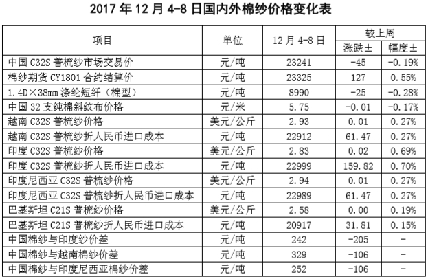 國(guó)際棉價(jià)面臨回調(diào)壓力。美國(guó)稅改推動(dòng)美元指數(shù)連續(xù)兩周上漲,美國(guó)勞工部公布的最新數(shù)據(jù)顯示,美國(guó)11月非農(nóng)就業(yè)人口超預(yù)期,薪資增長(zhǎng)大致符合預(yù)期,市場(chǎng)靜候下周美聯(lián)儲(chǔ)加息?;久嫔?,國(guó)際棉價(jià)連續(xù)上漲幾周后,美棉需求開(kāi)始明顯減少,11月24-30日2017/18年度美棉出口凈簽約量4.23萬(wàn)噸,較前周減少33%,較前四周平均值減少45%。據(jù)了解,美國(guó)長(zhǎng)絨棉產(chǎn)量可能低于USDA預(yù)測(cè),造成相當(dāng)數(shù)量皮馬棉合同被毀約,11月24-30日2017/18年度皮馬棉取消達(dá)1.1萬(wàn)噸,皮馬棉凈出口簽約量為-2903噸,較前周和前四周平均值大幅減少,創(chuàng)本年度新低;印度棉花在使用殺蟲(chóng)劑后,后期采摘的新棉質(zhì)量明顯改善,市場(chǎng)對(duì)印度蟲(chóng)害擔(dān)憂也將隨之消退,在全球棉花增產(chǎn)預(yù)期及美棉需求減弱的壓力下,預(yù)計(jì)國(guó)際棉價(jià)將面臨回調(diào)壓力。