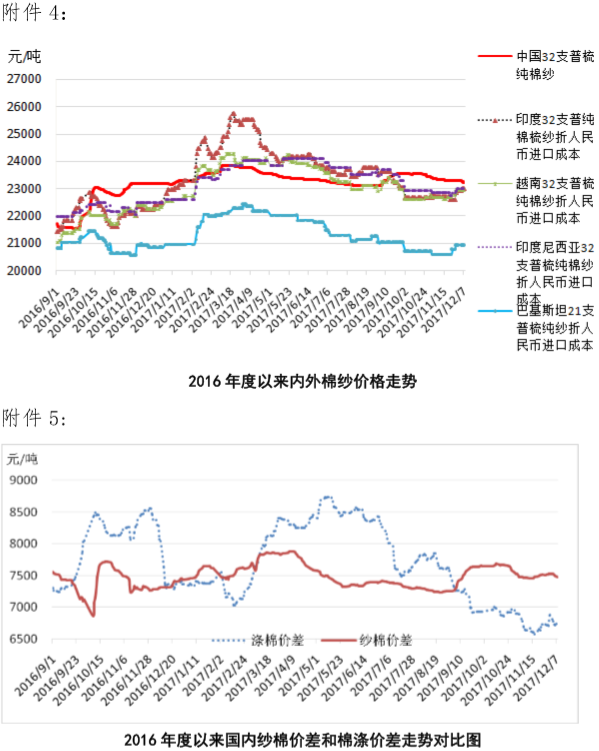 附件4:2016年度以來(lái)國(guó)內(nèi)外棉紗價(jià)格走勢(shì)圖