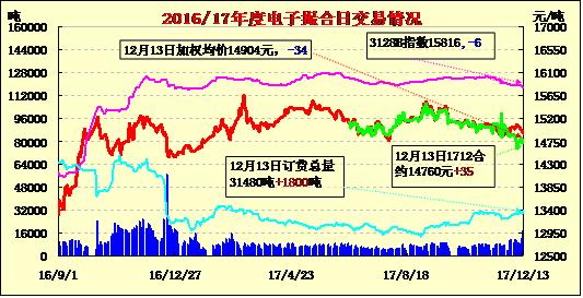 13日電子撮合交易成交量增加,整體合同均價多數(shù)收跌,整體合同下跌幅度較小,其中MA805成交量較大為4510噸;活躍交投的合同多集中于遠期合同,整體訂貨量總量有所增加,其中MA1803訂貨量最大,累計訂貨量7930噸。截止到12月12日24點新疆地區(qū)皮棉加工總量411.83萬噸,其中兵團加工量136.5萬噸,地方加工量275.33萬噸,日增量4.11萬噸。棉花現(xiàn)貨成交一般,新棉銷售進度緩慢,多貿(mào)易商采購為主,紡企參與積極性低下,地產(chǎn)棉雙28級價格14500元/噸左右,北疆雙29級價格15300-15600元/噸毛重,棉企多順價銷售,消化庫存。