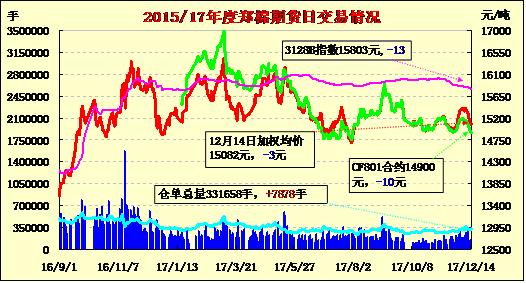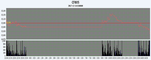 | CF805 | 15095 | 15170 | 15000 | 15015 | 15085 | -5 | 147640 | 46024 | 3297568 | 256702 | 10388 |