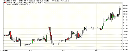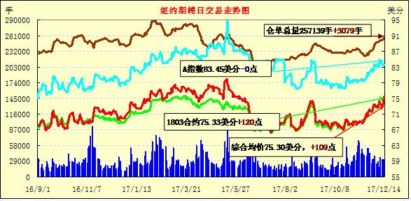 周四紐約期棉延續(xù)前一日走勢(shì),繼續(xù)大幅上漲,1803合約收于75.33美分/磅,漲120點(diǎn);1805合約收于75.63美分/磅,漲108點(diǎn)。當(dāng)日3月合約在開盤后短暫震蕩后上漲,最高價(jià)達(dá)到75.56美分/磅,創(chuàng)今年3月下旬以來(lái)最高,1803合約在近兩個(gè)交易日內(nèi)上漲242點(diǎn)。上周本年度美國(guó)陸地棉銷售5.9萬(wàn)噸,裝運(yùn)3.8萬(wàn)噸,累計(jì)簽約量達(dá)到預(yù)期出口量的73%,裝運(yùn)19%。