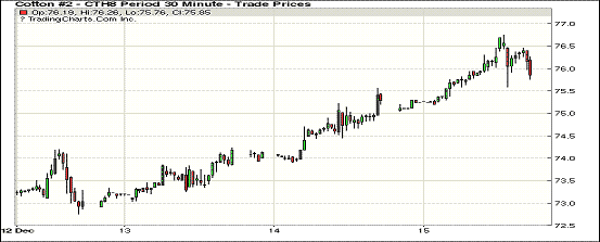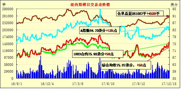 15日紐約期棉繼續(xù)收漲,近月1803合約創(chuàng)下該合約歷史高點(diǎn),結(jié)算價(jià)75.92美分/磅,較前一日上漲59點(diǎn),1805合約結(jié)算價(jià)76.32美分,漲69點(diǎn)。當(dāng)日3月合約整日交易重心朝上,開盤略高于75美分,盤中受投機(jī)買盤拉動(dòng)突破76美分,進(jìn)攻77美分動(dòng)力稍顯不足后從高位回落,最終收于76美分城下。據(jù)CFTC報(bào)告,ICE期棉未點(diǎn)價(jià)合約累計(jì)117449張,較前周增加3119張,去年同期未點(diǎn)價(jià)合約103112張。