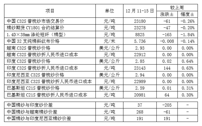 本周國內(nèi)棉紗庫存增加,市場低價走貨,回籠資金為主;國際棉紗價格跟隨外棉價格繼續(xù)上漲;國內(nèi)環(huán)保壓力下,噴水織機(jī)開率下降,坯布庫存小幅回升,純棉布價格繼續(xù)回落;受原料PTA走勢不佳影響,滌綸短纖價格重心弱勢為主。