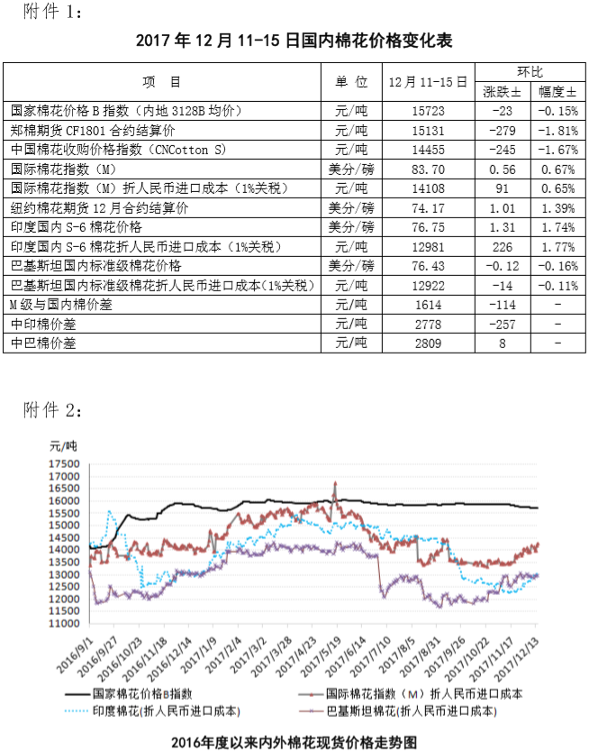附件1:2017年12月11-15日國內(nèi)外棉花價格變化表