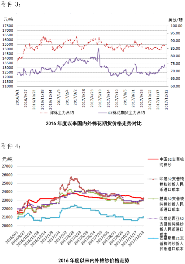 附件4:2016年度以來國內(nèi)外棉紗價格走勢圖