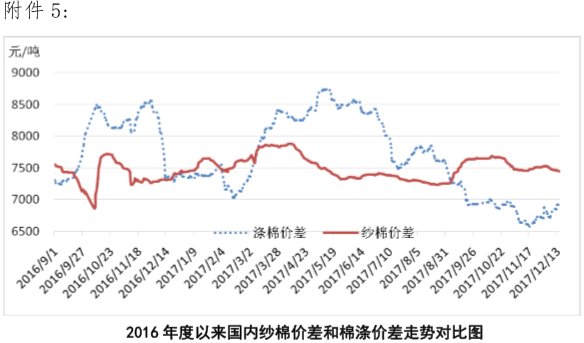 附件5:2016年度以來國內(nèi)紗棉價差和滌棉價差走勢對比圖