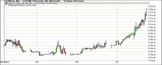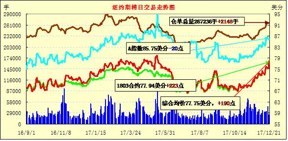 21日受美棉出口周報(bào)利好刺激,ICE期棉大幅度走高,近月1803合約結(jié)算價(jià)77.94美分/磅,上漲223點(diǎn),1805合約結(jié)算價(jià)77.96美分,漲184點(diǎn);1807合約78.17美分,漲184點(diǎn)。當(dāng)日3月合約開(kāi)盤(pán)后短暫停留75.5-76美分區(qū)間運(yùn)行,盤(pán)中重心延續(xù)向上行情一路圖片76、77美分,交易后期受美棉出口周報(bào)利好刺激繼續(xù)走高,尾段一度突破78美分,最終收于近高點(diǎn)。據(jù)美國(guó)農(nóng)業(yè)部(USDA),12.8-14一周美國(guó)2017/18年度陸地棉凈簽約出口74049噸,較前周增加26%,較近4周平均簽約量增加21%。