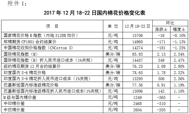 附件1:2017年12月18-22日國內(nèi)外棉花價格變化表