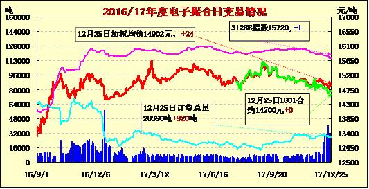 25日電子撮合交易成交量增加,整體合同均價(jià)全部收漲,整體合同上漲幅度較小,其中MA804成交量較大,為11980噸;活躍交投的合同多集中于遠(yuǎn)期合同,整體訂貨量總量有所增加,其中MA1803訂貨量最大,累計(jì)訂貨量為7390噸。國(guó)內(nèi)市場(chǎng)方面:截止到2017年12月24日24點(diǎn),新疆地區(qū)皮棉加工總量450.57萬(wàn)噸,其中,兵團(tuán)加工量144.47萬(wàn)噸,地方加工量306.10萬(wàn)噸,日增量2.83萬(wàn)噸。棉花現(xiàn)貨市場(chǎng)調(diào)整,南疆手摘長(zhǎng)度28cm,強(qiáng)力27左右的價(jià)格在15400元/噸毛重,同等級(jí)北疆機(jī)采價(jià)格在15200元/噸左右,目前紡企隨用隨購(gòu),而高等級(jí)棉花略顯緊俏,儲(chǔ)備疆棉價(jià)在15300-15800元/噸,地產(chǎn)在14000-15200元/噸左右。