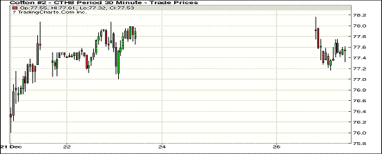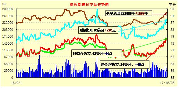26日圣誕節(jié)假期過(guò)后,紐約期棉市場(chǎng)成交清淡,整體收跌,近月1803合約結(jié)算價(jià)77.43美分/磅,跌44點(diǎn),1805合約結(jié)算價(jià)77.52美分,跌52點(diǎn),1807合約7,7.82美分,跌52點(diǎn)。本年度三個(gè)合約開(kāi)盤(pán)短暫停留在78美分以上,其中3月合約早盤(pán)重心向下,后在77美分尋找到支撐下半場(chǎng)交易圍繞77.3-77.7美分窄幅波動(dòng),終收于77.43美分。當(dāng)日成交量約1.24萬(wàn)手,為自今年8月21日(12233)來(lái)單日成交量最低水平。分析師指出,市場(chǎng)沖擊到78美分高位后技術(shù)面有超賣跡象,部分基金獲利平倉(cāng)對(duì)市場(chǎng)造成壓力。