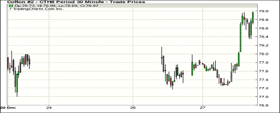 27日紐約期棉市場炒作印度因素全面上揚(yáng),本年度前三個合約漲幅過百,其他合約漲幅29-57點(diǎn)。近月1803合約結(jié)算價78.95美分/磅,漲152點(diǎn),1805合約結(jié)算價78.92美分,漲140點(diǎn),1807合約79.05美分,漲123點(diǎn)。當(dāng)日3月合約早盤在77.2-77.8美分之間波動,盤中集聚攻勢,一舉突破78美分后向79美分行進(jìn),最終在79美分附近收盤。據(jù)分析,印度因馬邦棉鈴蟲產(chǎn)量受到影響,印度棉花協(xié)會預(yù)計產(chǎn)量在640萬噸左右,但明間一些機(jī)構(gòu)較低預(yù)期在620萬噸左右。更為重要的是,市場普遍認(rèn)為美國農(nóng)業(yè)部平衡表中印度期末庫存數(shù)據(jù)偏高,如果一旦修正將利好市場。