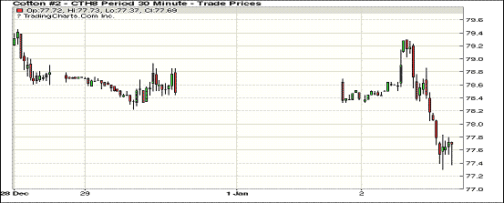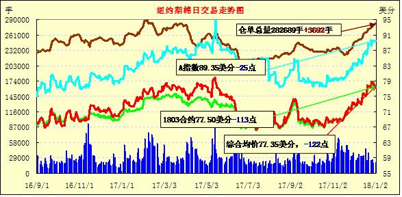 2018年首個(gè)交易日紐約期棉成交量增加,價(jià)格近跌遠(yuǎn)漲,近月1803合約結(jié)算價(jià)77.50美分/磅,跌113點(diǎn),1805合約結(jié)算價(jià)77.77美分,跌119點(diǎn),1807合約78.14美分,跌110點(diǎn);1812月合約74.13美分,跌38點(diǎn)。當(dāng)日3月合約穩(wěn)定開(kāi)盤(pán)后走高,盤(pán)中最高點(diǎn)觸及79.29美分(+66點(diǎn)),后受賣(mài)盤(pán)打壓從高位一路下滑,最終收跌百余點(diǎn)。分析指出,3月合約下跌受到技術(shù)面壓力,隨機(jī)指數(shù)和RSI指數(shù)仍顯示超買(mǎi)狀態(tài),短期內(nèi)市場(chǎng)仍有下跌壓力,下行支撐位在75.29美分,上行80.67美分有壓力。