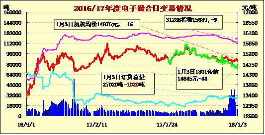 3日電子撮合交易成交量減少,整體合同均價(jià)全部收跌,整體合同下跌幅度較小,其中MA804成交量較大,為3030噸;活躍交投的合同多集中于遠(yuǎn)期合同,整體訂貨量總量有所減少,其中MA1805訂貨量最大,累計(jì)訂貨量為7260噸。截止到2018年1月2日24點(diǎn),新疆地區(qū)皮棉加工總量468.79萬噸,其中,兵團(tuán)加工量147.18萬噸,地方加工量321.61萬噸,日增量1.96萬噸。后棉花市場仍延續(xù)頹勢(shì),商家出貨心態(tài)濃重,價(jià)格仍基本維持,疆棉3129級(jí)價(jià)格在15500-15600元/噸公定自提,山東地區(qū)3128、27級(jí)報(bào)價(jià)14300-14700元/噸,部分質(zhì)優(yōu)嚴(yán)挑三絲報(bào)價(jià)15500-15800元/噸毛重,整體銷售相對(duì)困難,紡企多偏向疆棉,采購零星。