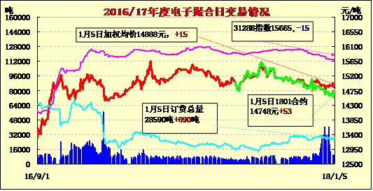 5日電子撮合交易成交量減少,整體合同均價(jià)多數(shù)收漲,整體合同上漲幅度較小,其中MA804成交量較大,為3350噸;活躍交投的合同多集中于遠(yuǎn)期合同,整體訂貨量總量有所增加,其中MA1804訂貨量最大,累計(jì)訂貨量7560噸。截止到2018年1月4日24點(diǎn),新疆地區(qū)皮棉加工總量471.85萬(wàn)噸,其中兵團(tuán)加工量147.63萬(wàn)噸,地方加工量324.23萬(wàn)噸,日增量1.59萬(wàn)噸。據(jù)本網(wǎng)信息員反饋,元旦期間,安徽東至天氣晴好,籽棉加工正常運(yùn)行,籽棉收購(gòu)恢復(fù)火熱。不過(guò)目前棉販交售的都是一棵樹的籽棉,加工后可達(dá)到4級(jí)左右,日收購(gòu)量約10萬(wàn)斤。收購(gòu)量大增的主要原因:部分小廠因皮棉銷售困難資金回籠緩慢,導(dǎo)致資金短缺,棉農(nóng)、棉販又不愿意賒賬,誰(shuí)有資金就賣給誰(shuí)。因此,棉農(nóng)、棉販集中賣到有資金實(shí)力的企業(yè),致使企業(yè)日收購(gòu)量大幅增加。