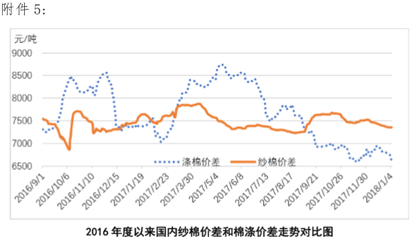 附件5:2016年度以來國內(nèi)紗棉價(jià)差和滌棉價(jià)差走勢對比圖