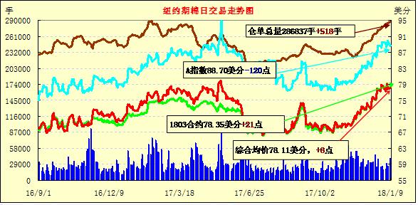 9日紐約期棉市場成交量下滑,價格繼續(xù)小幅收漲,近月1803合約結(jié)算價78.35美分/磅,漲21點,1805合約結(jié)算價78.69美分,漲22點,1807合約79.03美分,漲18點。當(dāng)日3月合約開盤短暫穩(wěn)定后向下波動,后跌至78美分遇買盤支撐反彈,交易后期震蕩上行,終以小幅下跌收盤。市場持倉量連日增加,但3月合約持倉呈減少趨勢。據(jù)分析,1月12日美國農(nóng)業(yè)部將發(fā)布月度供需預(yù)測,報告發(fā)布前市場交易氣氛以觀望為主。美棉現(xiàn)貨銷售低馬棉花銷售勢頭尚可。外部原油價格漲至近三年高點。