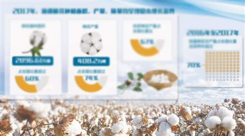 2017年,新疆棉花種植面積、產(chǎn)量、質(zhì)量均呈現(xiàn)穩(wěn)步增長態(tài)勢,棉花播種面積2896.61萬畝,占全國比重超過60%;棉花產(chǎn)量408.2萬噸,占全國比重超過74%;優(yōu)質(zhì)棉花產(chǎn)量占全國比重達67%。新疆棉花總產(chǎn)量占全國比重連續(xù)兩年超過70%,這表明新疆棉花成為國內(nèi)棉花供給重要支柱,“一枝獨秀”的供給格局已經(jīng)形成——