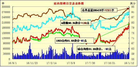 12日紐約期棉市場大幅波動,近月1803合約結算價81.68美分/磅,跌97點,1805合約結算價81.96美分,跌100點,1807合82.22美分,跌78點。當日3月合約穩(wěn)定開盤后走強,最高觸及84.65美分(+200點),創(chuàng)下該合約的歷史最高點。賣盤高點發(fā)力,市場調(diào)頭向下,后3月合約最低跌至80.3美分(-235點),日內(nèi)高低點波動幅度達到435點。USDA供需月報發(fā)布后,結果基本符合市場預期,市場穩(wěn)定略有回彈,最終收于81美分之上。據(jù)美國農(nóng)業(yè)部(USDA)月度供需報告,預期2017/18年度全球棉花產(chǎn)量2633.8萬噸,較上月調(diào)增22萬噸;消費量2630.7萬噸,調(diào)增27萬噸;期末庫存1911.5萬噸,調(diào)減4.4萬噸。