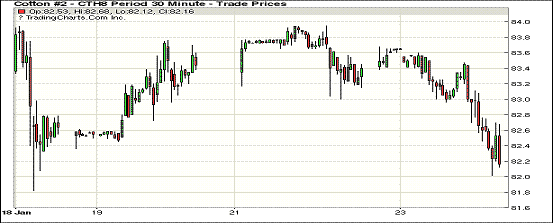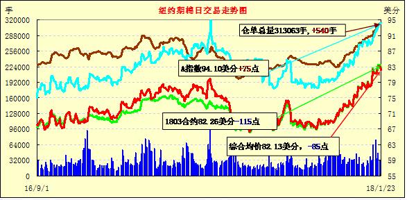 23日紐約期棉市場全線下跌,主力1803月合約結(jié)算價82.26美分/磅,跌115點(diǎn),1805月合約82.74美分,跌104點(diǎn),1807月合約83.19美分,跌100點(diǎn)。當(dāng)日3月合約穩(wěn)定開盤后,盤中穩(wěn)定于83美分以上,但交易后期受賣盤打壓下跌,最低點(diǎn)至82.01美分,盤中高低區(qū)間為167點(diǎn),終前三個合約跌幅過百。分析師指出,ICE期棉上一些指數(shù)基金和對沖基金開始3-5月合約移倉活動。外圍美元指數(shù)下跌,玉米和小麥期貨收跌,大豆期貨收漲。