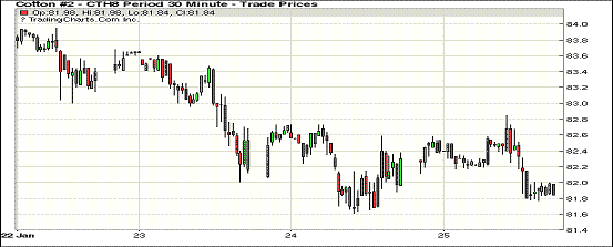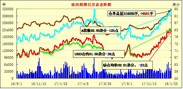 25日紐約期棉市場(chǎng)近跌遠(yuǎn)漲,近月1803合約結(jié)算價(jià)81.88美分/磅,跌39點(diǎn),1805合約結(jié)算價(jià)82.58美分,跌33點(diǎn),1807合約83.06美分,跌30點(diǎn),2019年度合約小幅收漲。當(dāng)日3月合約穩(wěn)定開(kāi)盤(pán)后穩(wěn)定在82.4-82.6美分之間波動(dòng),上沖缺乏買(mǎi)盤(pán)支持調(diào)頭向下,交易后期跌破82美分,終以小幅收跌。美棉出口周報(bào)推遲一天發(fā)布,交易商等待明確的方向指引。據(jù)CFTC報(bào)告,1月19日一周ICE期棉未點(diǎn)價(jià)銷(xiāo)售合約量有所增加,3月合約減少明顯,但5月合約和7月合約均有所增加。外圍美元指數(shù)小幅下跌,谷物期貨收漲。