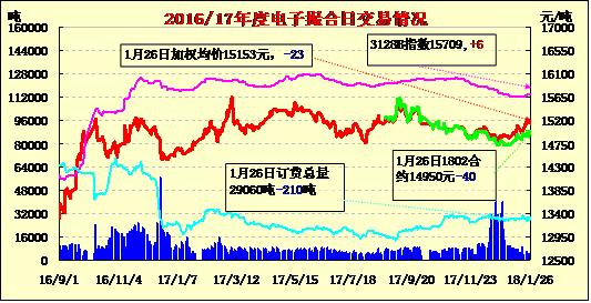 26日電子撮合交易成交量增加,整體合同均價漲跌互現(xiàn),整體合同下跌幅度較小,其中MA805成交量較大,為1180噸;活躍交投的合同多集中于遠(yuǎn)期合同,整體訂貨量總量有所減少,其中MA1805訂貨量最大,累計訂貨量為6950噸。目前紐約期棉距3月合約交割期越來越近,巨量的持倉將逐步展期或者平倉離場,這可能加劇棉價的波動幅度,雖然ON-CALL訂單已經(jīng)開始展期至遠(yuǎn)期合約,但I(xiàn)CE期棉的登記庫存不足5萬包,遠(yuǎn)遠(yuǎn)小于上年度同期的12萬余包,巨量持倉的轉(zhuǎn)移必將加劇棉價的波動,不排除未來ICE期棉繼續(xù)沖高的可能。