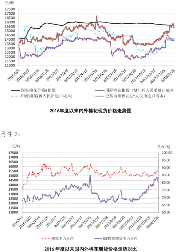 附件2:2016年度以來國內(nèi)外棉花現(xiàn)貨價(jià)格走勢圖