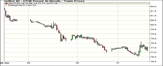 1月份最后一個(gè)交易日紐約期棉市場以小幅上漲收盤,近月1803合約結(jié)算價(jià)77.28美分/磅,漲25點(diǎn),1805合約結(jié)算價(jià)78.36美分,漲39點(diǎn),1807合約79.05美分,漲38點(diǎn),2019年度多數(shù)合約上漲2-36點(diǎn)不等。當(dāng)日3月合約小幅高開,早盤穩(wěn)定在77.5美分一線,交易中期承壓下跌,破位77美分,后在76.5美分獲買盤支持反彈短暫突破78美分,終以小幅收高,結(jié)束四連陰。前一周美棉本年度陸地棉凈簽約量大幅度減少,對(duì)期貨形成壓力,市場等待本周出口周報(bào)。