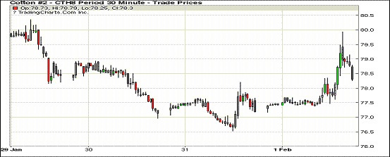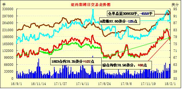 2月份第一個(gè)交易日紐約期棉市場大幅收漲,近月1803合約結(jié)算價(jià)78.35美分/磅,漲107點(diǎn),1805合約結(jié)算價(jià)79.45美分,漲109點(diǎn),1812合約75.42美分,漲91點(diǎn)。當(dāng)日3月合約上半場表現(xiàn)平淡無奇,美棉出口周報(bào)發(fā)布后市場迅速走高,交易后期重心向上突破78美分,并以大漲收盤。據(jù)美國農(nóng)業(yè)部(USDA),1.19-1.25日一周美國凈簽約出口2017/18年度陸地棉68787噸(含新簽約72711噸,另取消約3000多噸前期訂單),較前一周大幅度增加,較近4周平均簽約量增加50%;裝運(yùn)2017/18年度陸地棉69185噸,創(chuàng)年度新高,較前周增加31%,較近4周平均增加21%。