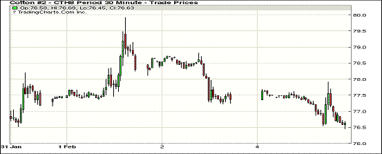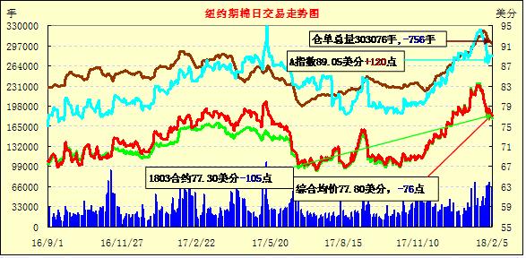 5日紐約期棉延續(xù)跌勢,1803合約結(jié)算價76.57美分/磅,跌73點,1805合約結(jié)算價77.90美分,跌71點,1812合約74.75美分,跌33點。當日5月合約上半場交易重心下滑,盤中跌至78美分時觸發(fā)買盤,市場躥高,但突破79美分后遇壓迅速下滑,最終跌回78美分以下。期棉單日總成交量維持高位,分析指出,由于美國股市大跌,或有投機資金抽離股市進入商品期貨市場。
