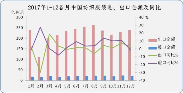 在全球經(jīng)濟復蘇外需回暖、國內經(jīng)濟持續(xù)向好、去年同期基數(shù)較低的共同作用下,2017年中國紡織品服裝對外貿易始終是“穩(wěn)”字當頭,尤其是下半年,出口連續(xù)多月保持平穩(wěn)、小幅增長,四季度增幅升至3.7%,使得全年出口在經(jīng)歷連續(xù)2年下跌后,終于撥得云開見月明,再次實現(xiàn)增長。