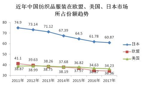 從數(shù)據(jù)上看,今年以來中國在日本市場所占份額持續(xù)下降趨勢仍沒有改變,但產業(yè)轉移速度較前幾年明顯放緩。1-11月中國產品在日本市場上的份額為60.9%,比去年同期下降0.9個百分點,下降速度明顯趨緩。企業(yè)對此也有相同感受,據(jù)出口日本的主營企業(yè)反映,當前日本相對其他市場進一步好轉,尤其中高檔產品在日本銷量能夠實現(xiàn)穩(wěn)定增長。同時在歐盟市場份額下降速度也有所減緩,1-10月份額為34.2%,比去年同期僅下降0.4個百分點。相對而言,我國產品在美國市場份額變化幅度最小,2011-2017年6年間累計下降2.5個百分點,遠好于歐盟、日本。