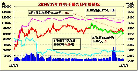 6日電子撮合交易成交量增加,整體合同均價多數(shù)收漲,整體合同上漲幅度較小,其中MA805成交量較大,為2330噸;活躍交投的合同多集中于遠期合同,整體訂貨量總量有所增加,其中MA1805訂貨量最大,累計訂貨量為8130噸。隔夜美棉震蕩回落,主力3月合約雖然盤中沖高至77.91美分/磅,但在基金多頭平倉賣盤壓力下最終收跌0.73美分至76.57美分/磅,期價創(chuàng)近7周新低。數(shù)據(jù)顯示截至2月2日紐約期棉市場總持倉減少3167手至299909手,3月合約持倉依然高達近10萬手,顯示基金無心戀戰(zhàn)美棉并未全部展期至遠期合約,在此情況下,在3月合約展期未結(jié)束前,紐約期棉均將遭受多單平倉賣盤的壓力。