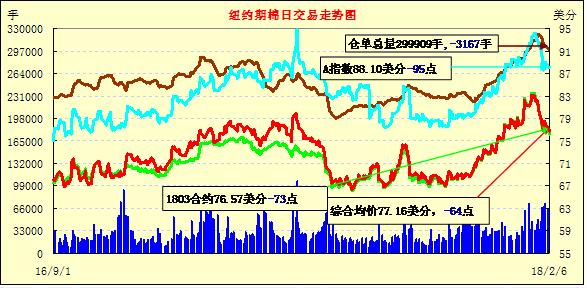 6日紐約期棉市場近跌遠漲,近月1803合約結算價76.19美分/磅,跌38點,1805合約結算價77.38美分,跌52點,1812合約75.78美分,漲11點。當日5月合約整日交易平淡,雖然該合約連續(xù)多次試圖穩(wěn)定在78美分以上失敗,但下跌動力不足,終小幅收跌。市場主要關注美國股市和商品市場整體表現(xiàn)。基本面關注美國棉花出口周報和2月10日NCC(美國國家棉花總會)將發(fā)布的美棉下年度種植預期。