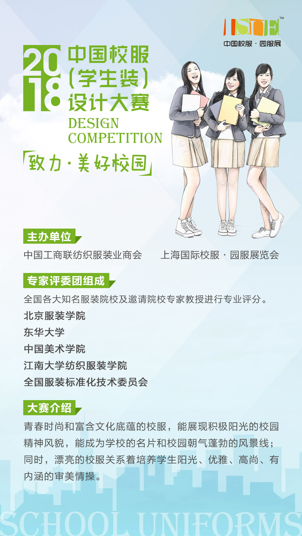大賽秉承公平、公正、透明的原則,組委會(huì)對(duì)所有作品進(jìn)行匿名評(píng)分。根據(jù)大賽基本要求和作品基本質(zhì)量,從所搜集作品中共篩選898份優(yōu)秀作品進(jìn)入專家評(píng)分環(huán)節(jié)。通過設(shè)計(jì)稿評(píng)分平均值進(jìn)行排名,小學(xué)生和中學(xué)生各系列分別選擇前7名進(jìn)入決賽環(huán)節(jié),根據(jù)入圍設(shè)計(jì)稿制作樣衣參加“2018中國(guó)校服(學(xué)生裝)設(shè)計(jì)大賽T臺(tái)發(fā)布秀”決賽,最終決出本次大賽各系列的特等獎(jiǎng)、一等獎(jiǎng)、二等獎(jiǎng)、三等獎(jiǎng);幼兒園和教師職業(yè)裝系列將不參與走秀環(huán)節(jié),由各專家評(píng)分平均值直接產(chǎn)生各個(gè)獎(jiǎng)項(xiàng)。