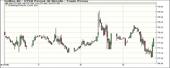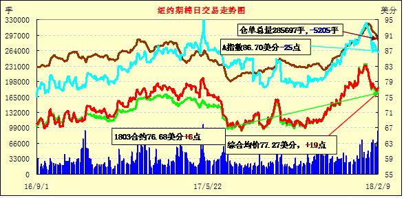 9日紐約期棉市場全面收漲,近月1803合約結算價76.68美分,漲6點;1805合約結算價77.63美分,漲7點;1807合約結算價78.58美分,漲8點。2019年度合約上漲8-28點不等。當日5月合約高開后穩(wěn)定運行,交易過程中重心整體偏上,盤中一度穩(wěn)定在78-78.27美分之間波動,后因上漲動力不足調頭向下,最低在77美分處獲得買盤支撐,最終小幅收漲。外圍美元指數(shù)小幅上漲,谷物期貨收跌?;久骊P注NCC(美國國家棉花總會)即將發(fā)布的美棉下年度種植預期。