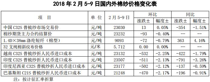 近期國內(nèi)棉紗產(chǎn)銷率提高,棉紗價格延續(xù)小幅上漲;外紗價格隨國際棉價繼續(xù)回落;國內(nèi)坯布市場進入春節(jié)假期,純棉布價格無變化;滌綸短纖價格隨石油走勢下跌。