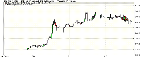 22日紐約期棉市場主力合約收跌,近月1803合約結(jié)算價80.54美分,漲163點;1805合約結(jié)算價79.47美分,跌92點;1807合約結(jié)算價80.41美分,跌69點;1812合約結(jié)算價76.36美分,跌4點。當(dāng)日5月合約整日交易震蕩運行,小幅低開后缺乏買盤支撐迅速下跌,后買盤入場,交易重心上行突破80美分,在高點80.52美分處受獲利了結(jié)盤打壓下跌,盤中維持窄幅波動,一路震蕩下行,在低點79.23美分處觸發(fā)買盤小幅回彈,但因上漲動力不足最終收跌。外圍美元指數(shù)下跌,玉米和小麥期貨下跌,玉米期貨上漲。