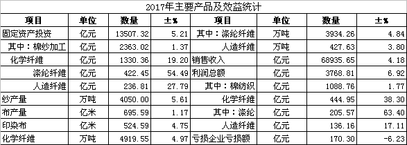2017年,全國(guó)紡織服裝行業(yè)經(jīng)濟(jì)效益有所提升,虧損企業(yè)虧損額有所下降,化纖行業(yè)表現(xiàn)尤為突出。據(jù)統(tǒng)計(jì),2017年全行業(yè)實(shí)現(xiàn)銷售收入68935.65億元,同比增長(zhǎng)4.18%;利潤(rùn)總額3768.81億元,同比增長(zhǎng)6.92%,增速較上年提高2.4個(gè)百分點(diǎn)。其中化纖業(yè)同比增長(zhǎng)38.3%,滌綸纖維增長(zhǎng)63.4%、人造纖維增長(zhǎng)17.1%,大大高于全行業(yè)平均水平,而棉紡織業(yè)僅增長(zhǎng)1.8%。全行業(yè)虧損企業(yè)虧損額同比下降6.2%,其中化纖業(yè)大幅下降41.3%,滌綸纖維下降71.2%。值得關(guān)注的是,全行業(yè)產(chǎn)成品資金同比僅增長(zhǎng)3.7%,增速遠(yuǎn)低于生產(chǎn)、銷售收入等指標(biāo),尤其是棉紡織業(yè)在生產(chǎn)增長(zhǎng)4-5%、銷售收入增長(zhǎng)3.4%的情況下,產(chǎn)成品資金僅微增1.5%,反映產(chǎn)銷平穩(wěn),產(chǎn)品庫(kù)存壓力小,形勢(shì)較為樂(lè)觀。附表:2017年主要產(chǎn)品產(chǎn)量及效益統(tǒng)計(jì)