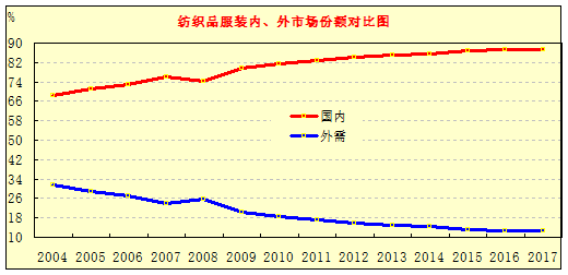 內(nèi)需平穩(wěn)回升。據(jù)國(guó)家統(tǒng)計(jì)局資料顯示,2017年我國(guó)社會(huì)消費(fèi)品零售總額達(dá)366262億元,同比增長(zhǎng)10.2%,其中服裝、針紡織品14557億元,增長(zhǎng)7.8%,較上年增速提高0.8個(gè)百分點(diǎn),這是7年來(lái)增速首次提高,零售額大幅增長(zhǎng)反映出國(guó)內(nèi)不斷穩(wěn)健提升。另從紡織服裝出口與內(nèi)銷比重分析看,內(nèi)銷比例明顯提升。2004年我國(guó)紡織品服裝30%以上依賴出口,即內(nèi)外銷比為70:30,2017年內(nèi)外銷比為88:12。附圖:2004年來(lái)內(nèi)外市場(chǎng)份額變化