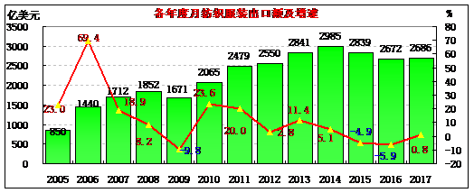 外需逐漸回暖。受全球經(jīng)濟(jì)穩(wěn)健復(fù)蘇影響,2017年我國(guó)紡織品服裝出口扭轉(zhuǎn)連續(xù)2年負(fù)增長(zhǎng)局面,出口2685.96億美元,同比增長(zhǎng)0.8%。